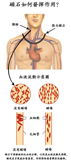 在損傷的部位施用磁石會使血管以及周圍的肌肉和結締組織放鬆及擴張,以促進循環。與此同時,磁石會吸附紅血球内的鐵質(紅血蛋白),故把更多血液,連同更多氧氣、營養素和白血球一併載送至損傷部位,以加速愈合過程。在離開該部位時,血液會把毒素和其他廢物也移走,有利於排毒和在再生過程。